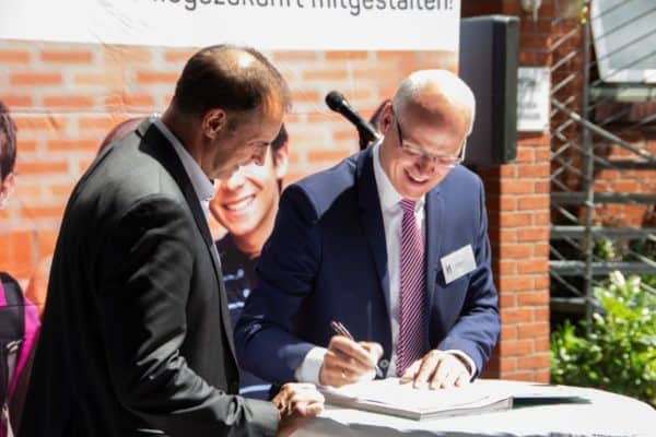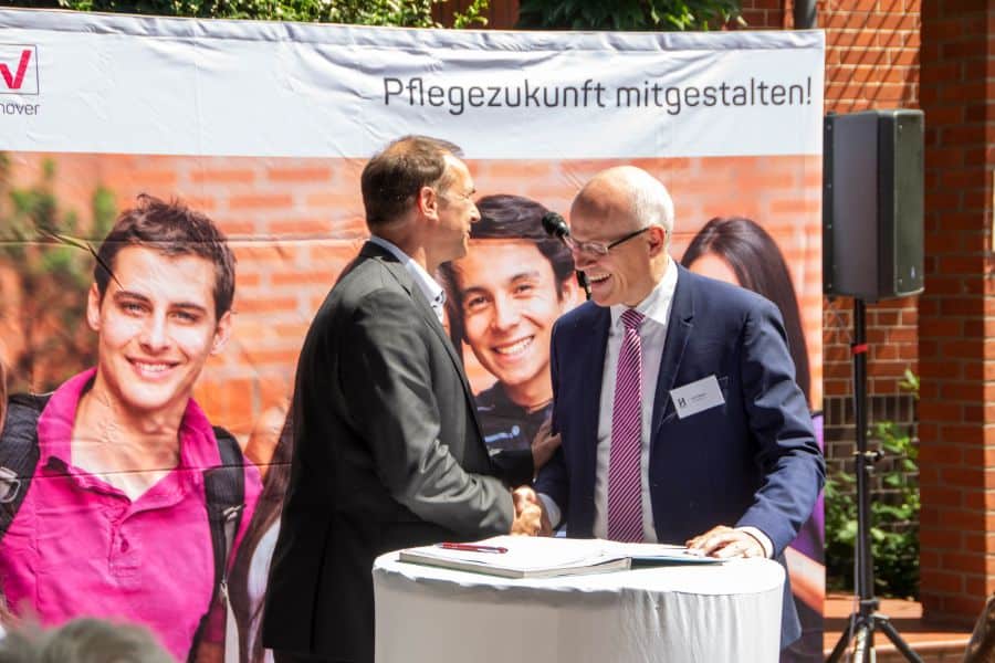 Am Dienstag, 2. Juli 2019 zwischen 14.00 und 15.00 Uhr zelebrierten beide Unternehmen die Vertragsunterschrift im Rahmen einer Feierstunde auf dem Schulgelände der PFSH. Neben den Vertragspartnern und der Schülerschaft der PFSH war der Bürgermeister der Stadt Garbsen Herr Dr. Christian Grahl zugegen. Denn die Kooperation stärkt den Ausbildungsstandort Garbsen / Meyenfeld sowie die Pflege in der Region nachhaltig.