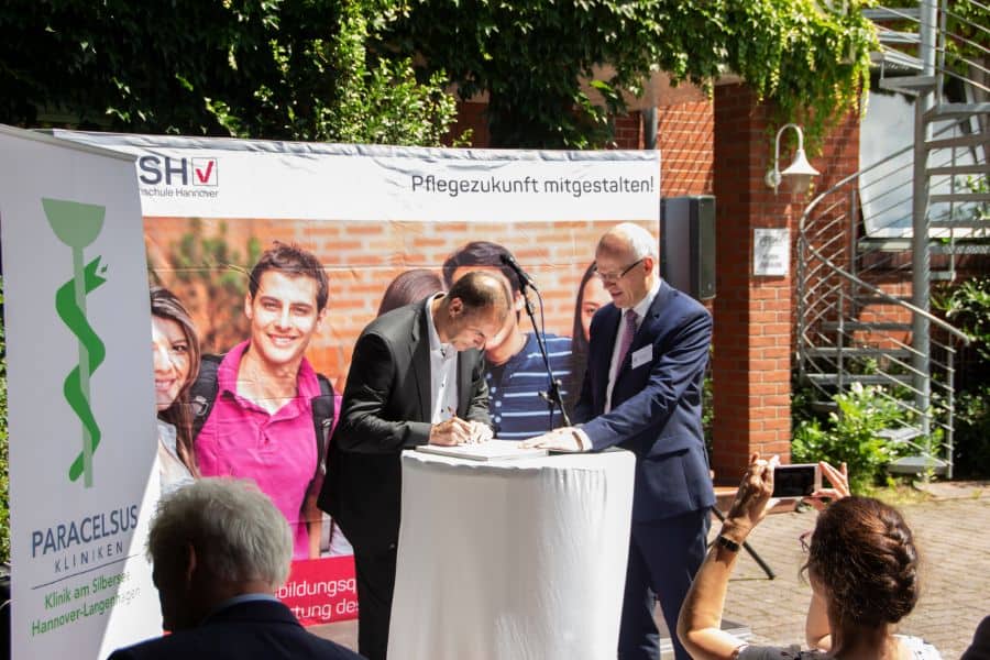 Am Dienstag, 2. Juli 2019 zwischen 14.00 und 15.00 Uhr zelebrierten beide Unternehmen die Vertragsunterschrift im Rahmen einer Feierstunde auf dem Schulgelände der PFSH. Neben den Vertragspartnern und der Schülerschaft der PFSH war der Bürgermeister der Stadt Garbsen Herr Dr. Christian Grahl zugegen. Denn die Kooperation stärkt den Ausbildungsstandort Garbsen / Meyenfeld sowie die Pflege in der Region nachhaltig.