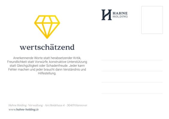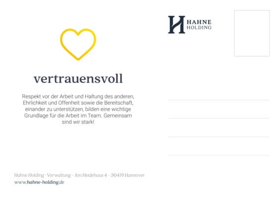 Die Hahne Holding als Dachgesellschaft ist für viele Menschen Arbeitgeber, Geschäftspartner und Dienstleister. Der Geschäftsführung liegt es am Herzen, dass die gesamte Unternehmensgruppe ein verlässliches und klares Profil in allen Bereiche hat – ganz egal, welche Art von Beziehung die einzelnen Menschen zum Unternehmen haben. Aus diesem Grund hat eine Arbeitsgruppe aus allen Bereichen der Holding gemeinsam die Werte, für die jede einzelne Einheit steht, neu formuliert. Egal ob ambulanter Dienst, Altenheim, Verwaltung oder Schule – ein gemeinsames, gelebtes Werteverständnis macht den Unterschied. Diese definieren, wie Kollegen miteinander umgehen, aber auch, wie wir uns gegenüber Kunden, Partnern, Auszubildenden und Interessenten verhalten.